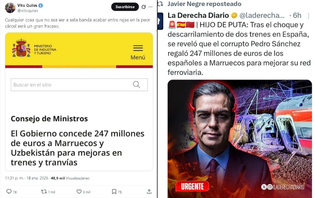 La maquinaria de la desinformación se puso en marcha pocas horas después de conocerse el fatídico choque de dos trenes de alta velocidad a la altura de Adamuz, Córdoba, que por el momento se ha cobrado 39 vidas. Entre los primeros en hacer de altavoz a bulos que responsabilizan directamente a Pedro Sánchez de la catástrofe se cuentan los agitadores ultraderechistas Javier Negre, afincado en EE UU, y Vito Quiles, este desde España. Ambos difundieron en redes una publicación en la que se afirma que “el corrupto Pedro Sánchez regaló 247 millones de euros de los españoles a Marruecos para mejorar su red ferroviaria”. Lo que no se dice es que esa cantidad, que en realidad fueron 750 millones, eran préstamos que el país vecino deberá devolver con intereses y que tendrá que gastar en contratación con empresas españolas. Pero eso da igual. Lo importante es colocar el mensaje, por averiado que esté, en un momento de conmoción nacional en el que la gente busca respuestas y lo visceral puede anteponerse a lo racional.El eurodiputado Alvise Pérez, otro habitual de las redes de desinformación, se sumó a ese carro unas horas más tarde diciendo por su canal de Telegram, que cuenta con casi 650.000 suscriptores, que “Sánchez aprobó créditos por 1.400 millones para proyectos ferroviarios en Marruecos, Egipto y Uzbekistán mientras se denunciaban deficiencias graves de inversión en trenes en España”.Capturas de pantalla del chat de Telegram de Alvise Pérez.El experto en redes y ciberseguridad Marcelino Madrigal ha analizado esta mañana unos 400 mensajes enviados por Telegram que mencionan al ministro de Transportes, Óscar Puente, contra quien se está volcando gran parte del odio vertido en redes. Madrigal corrobora que los canales de Alvise son los que más mensajes difunden sobre Puente, así como que la narrativa de los mismos tiene que ver con la supuesta dejación de funciones al no llevar a cabo un mantenimiento adecuado de las infraestructuras.Un discurso que coincide el del líder de Vox, Santiago Abascal, que ha querido vincular al Gobierno con el descarrilamiento. “El colapso de un Gobierno mafioso está amenazando con colapsar a todo el Estado tanto a nivel nacional como internacional. Punto”, ha indicado Abascal en un mensaje publicado en su cuenta de la red social X. “Nos gobierna el crimen, la mentira y la traición a los intereses del pueblo”, ha añadido.Madrigal también detecta la posible coordinación de algunas cuentas, ya que muchos de los mensajes escrutados se mandaron exactamente a la misma hora, con diferencia de segundos. Es un fenómeno que, en su experiencia, sucede “continuamente”. Insistiendo en la negligencia criminal, la cuenta de Sr Liberal, otro influencer ultra con más de 160.000 seguidores en X, aseguró varias veces que en el Gobierno “lo sabían todo”: “Ni un minuto más a los mandos del Ministerio. Lo sabía, sabían lo que le pasaba a la vía”.Los ataques van principalmente dirigidos contra el Gobierno, pero no solo. Han circulado por redes imágenes de una periodista de TVE, Lourdes Maldonado, sonriendo mientras hablaba de la tragedia. Se trata de una imagen descontextualizada, pues la captura se hizo justo en el momento en el que la presentadora contaba un caso de solidaridad del pueblo de Adamuz. Pese a ello, decenas de cuentas se han ensañado con ella y con la corporación pública por no mostrar respeto hacia las víctimas. Lo mismo ha sucedido con otra imagen en la que se ve a un Óscar Puente sonriente y que también circula por redes junto con mensajes incendiarios.Algunos medios han publicado imágenes falsas del choque de trenes, generadas por inteligencia artificial (IA). Un patrón conocidoLas catástrofes son un avispero muy del agrado de agitadores y desinformadores profesionales. Se vio en octubre de 2024, cuando la dana que mató a 229 personas en Valencia se aprovechó para difundir todo tipo de bulos, desde los que amplificaban el número de víctimas mortales hasta los que llamaban a la organización ciudadana para suplir la supuesta inoperancia de las instituciones.Lo mismo, aunque esta vez sin tragedia mortal de por medio, pero sí con un tufo abiertamente racista, sucedió el año pasado en Torre Pacheco, Murcia, cuando la paliza que sufrió un hombre se usó para organizar “cacerías de inmigrantes” por la zona. El vídeo que se viralizó correspondía a un episodio distinto, pero nada de ello evitó que se desatara una oleada de ataques racistas que mantuvo en vilo a la población durante días.